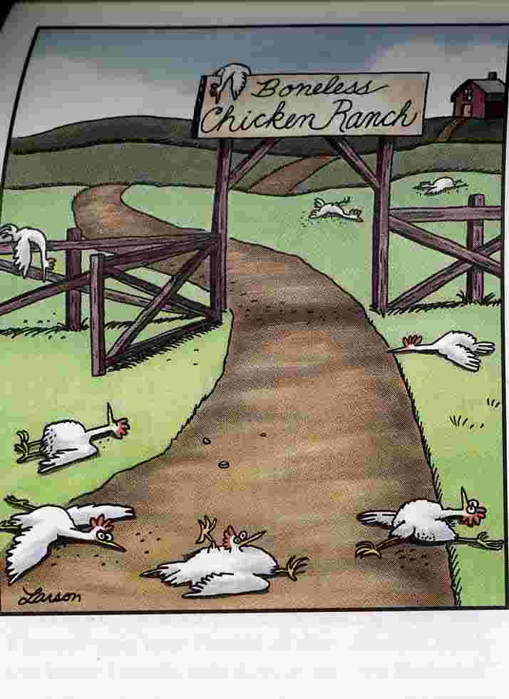 As I was preparing this recipe last night, I began to laugh as I remembered Gary Larson’s “Far Side” illustration of the “Boneless Chicken Ranch”. When it first appeared in the newspaper back in the 1980’s, my husband and I thought it was so funny, we displayed it on our refrigerator for months! Those poor chickens! What a terrible way to live!