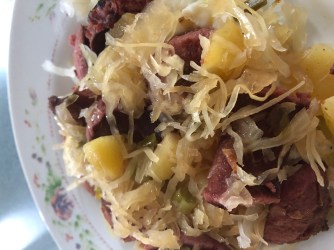 I would expect that many of us are feeling a little “sour” at the moment as we face another week of Coronavirus confinement. One of the things, however, that has lessened the “sourness” for me and actually “sweetened” the experience is the lovely amount of time I have had to create some yummy meals. Here’s one that I think you’ll really enjoy. It’s easy to make and for those of you who aren’t sauerkraut lovers, this recipe really lessens the sourness by first draining and rinsing the kraut, and then adding brown sugar to the mix!